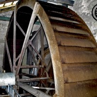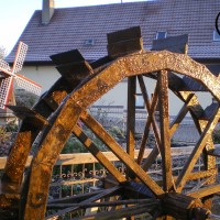 1884 wurde das heute noch in Betrieb befindliche oberschlächtige Wasserrad mit dem imposanten Durchmesser von knapp 7 Meter eingebaut.