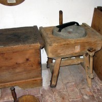 Eine Hausmühle von 1850 mit einem altem Mahlgang, umgesetzt in das Privatmuseum der Familie Schelshorn. Ein oberschlächtiges Wasserrad aus Oberbayern hat das schadhafte Wasserrad ersetzt.